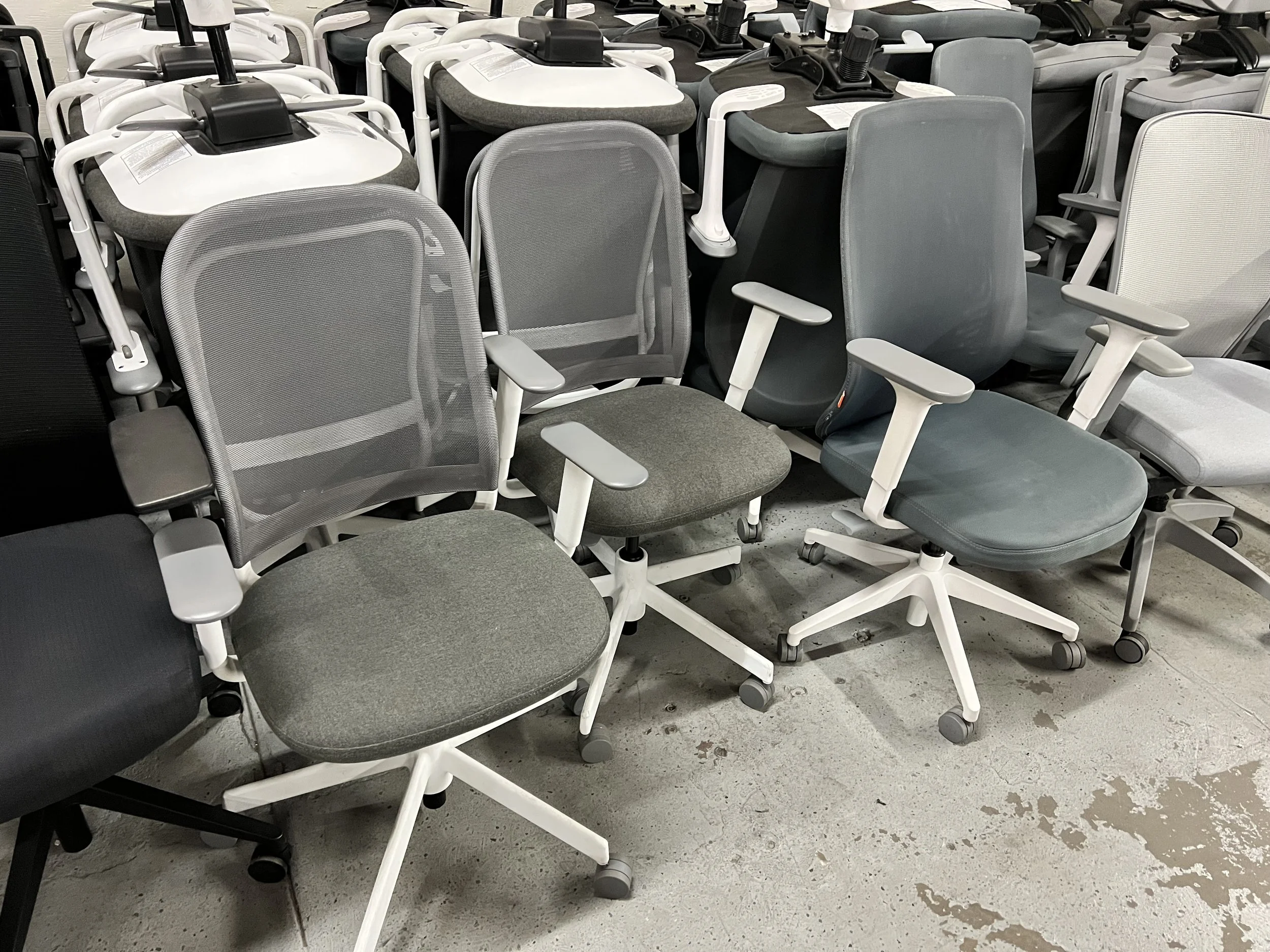 We have around (50) POPPIN task chairs. POPPIN chairs are fully ergonomic and very comfy chairs. We have two sets the grey/bluish on white and the grey on white. All are clean and ready for duty. Unloading for $150 ea. or buy more for a better price.