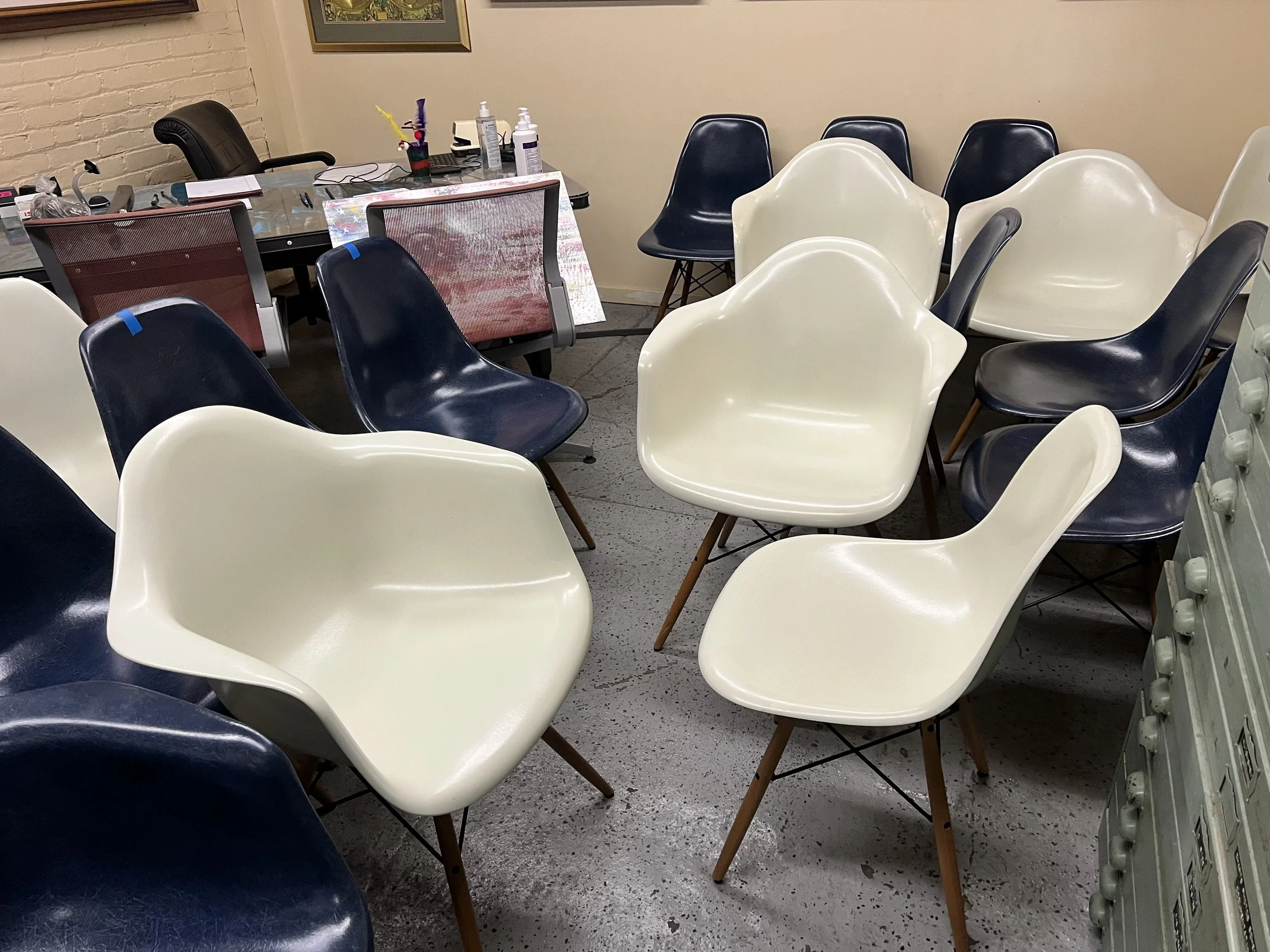 We have a variety of Herman Miller Eames Firberglass Armchairs and Side chairs in two colors. White and Blue. The fiberglass series is the most sought after and not easy to come by in the used market. Specially these with the Dowell Base